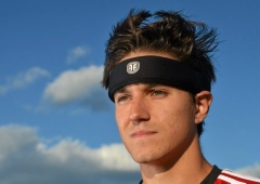 wears a fully-padded headband meant to protect